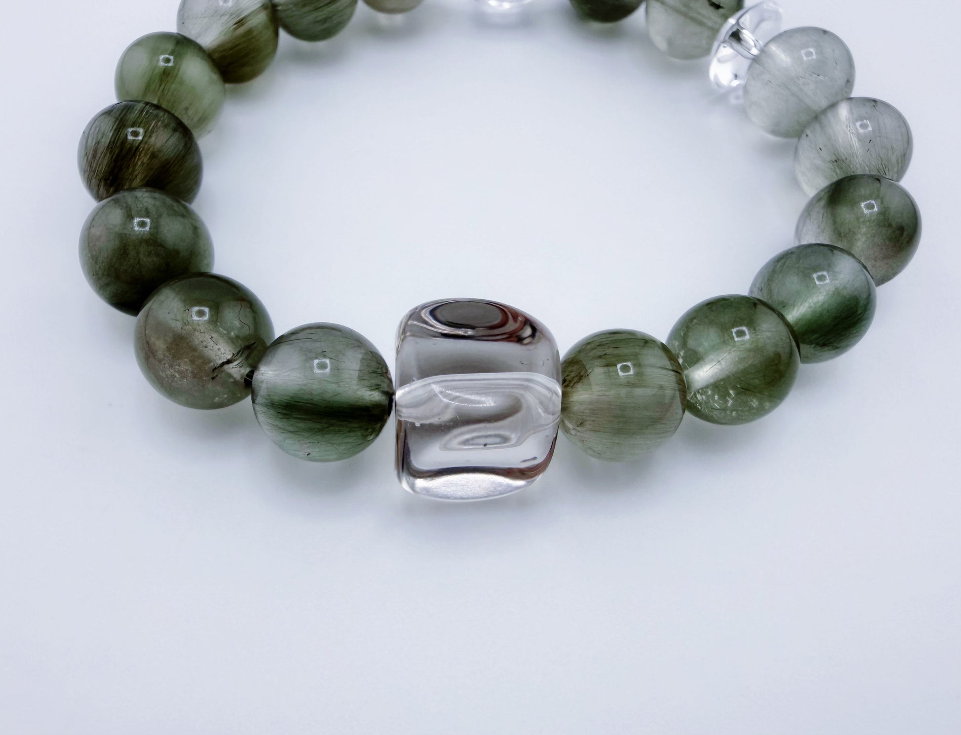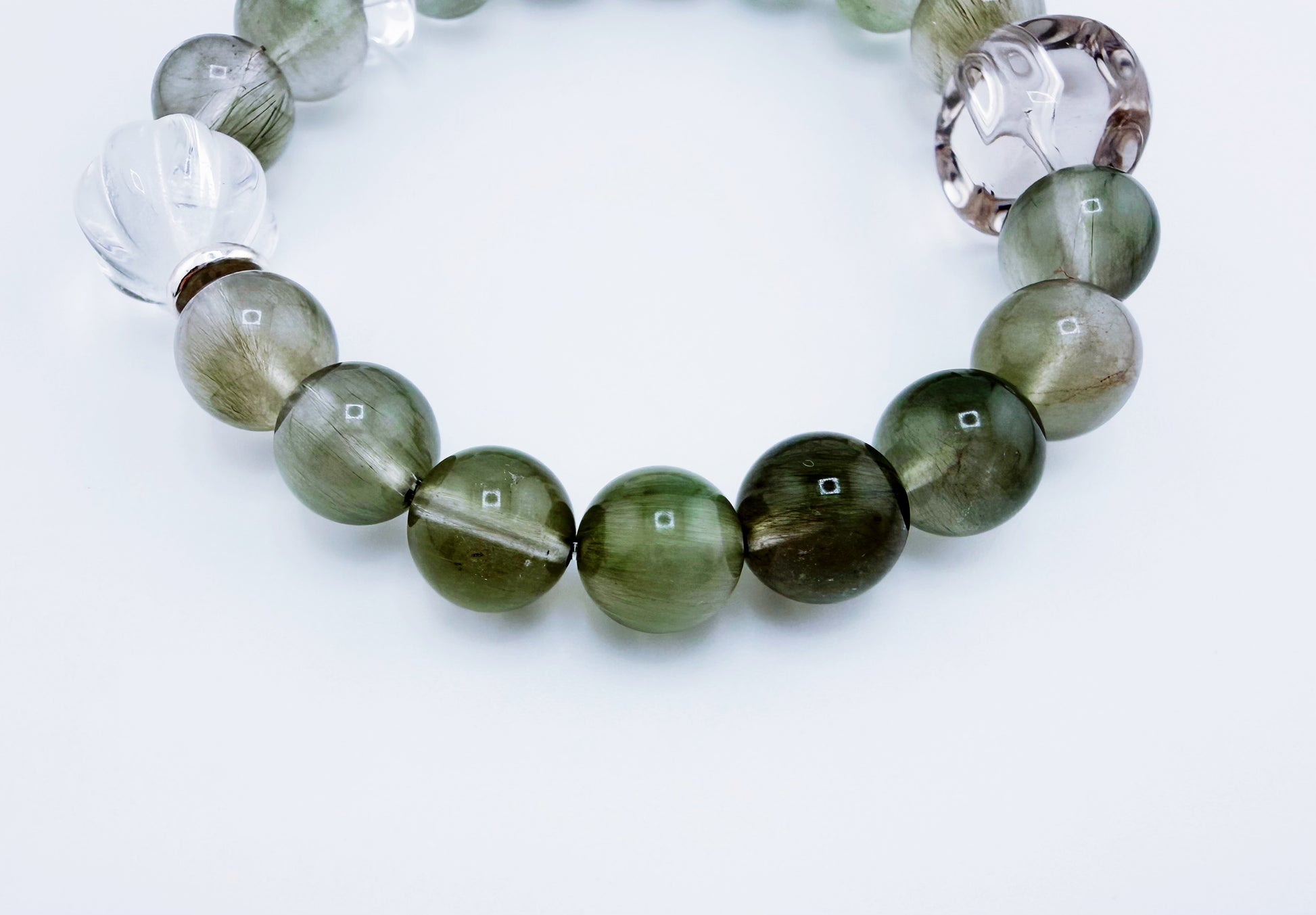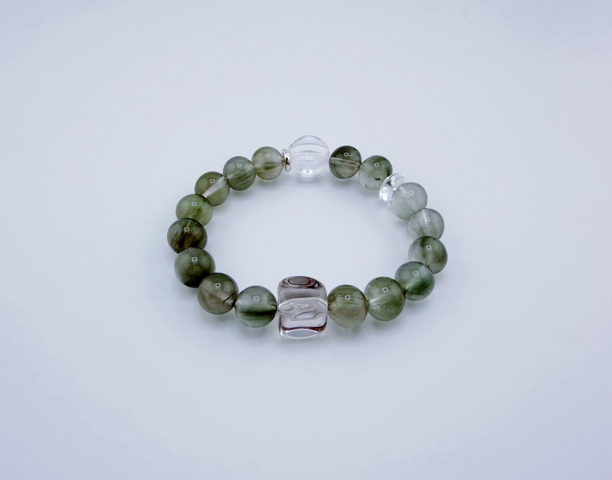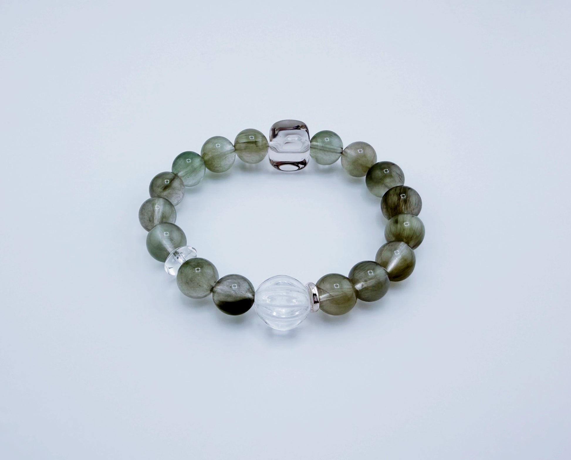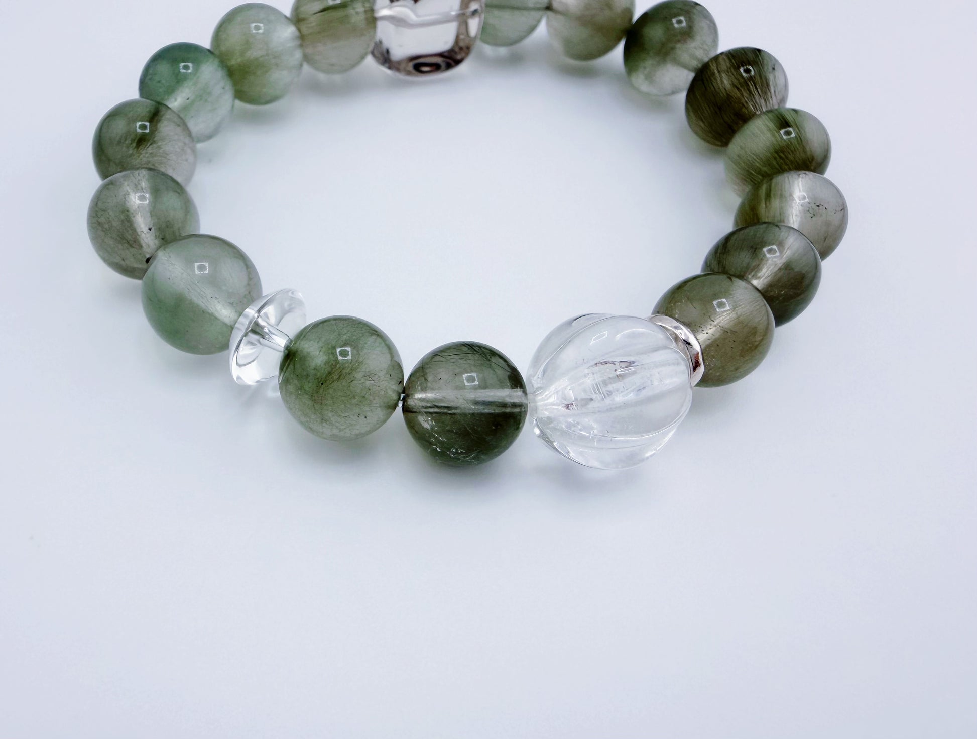S925低敏純銀/天然綠兔毛水晶/白水晶隨形石/白水晶螺紋珠 |